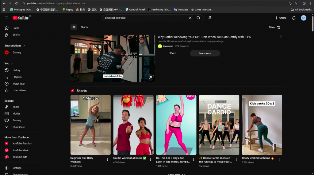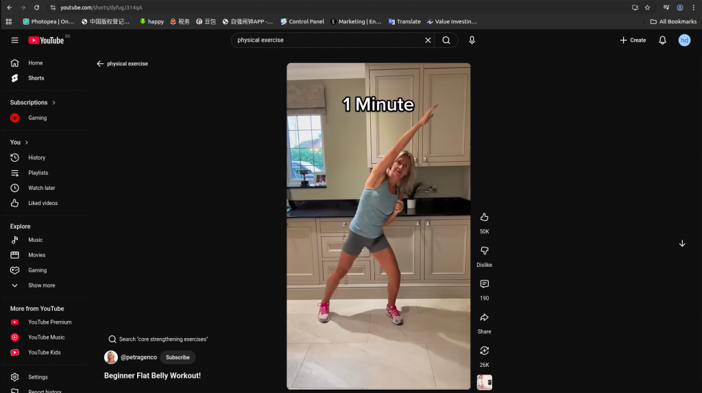 youtube找到目标内容By actorsun / January 18, 2026 1 搜索关键词例如 physical exercise 2 点击shorts部分视频———比如这里直接点击shorts下面第一个视频: 3 不断下滑,这个时候所有的视频都是相关的。 因为左上角有一个physical exercise的标志。